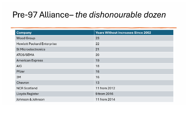 The Minister will be well aware that there is no requirement for pension indexation for service before 1997. The Pre-1997 Alliance speaks for more than 50,000 pensioners from the company schemes listed below with the number of years each scheme has been without increases since 2002. We have reason to believe that these companies received professional advice that pointed out the unintended “opportunities” of Pension Act 1995. The subsequent changes in their practice of annual payment of discretionary increases may reflect the effect of this advice.